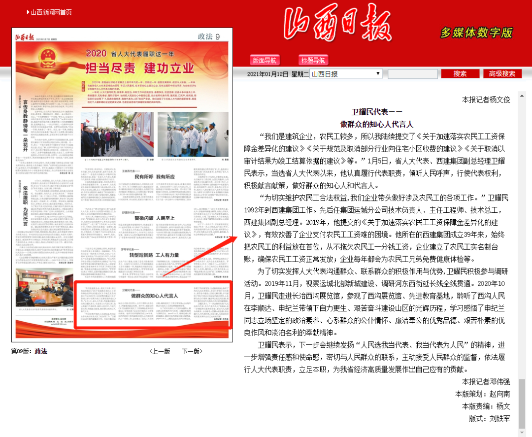 “為切實(shí)維護(hù)農(nóng)民工合法權(quán)益,我們企業(yè)帶頭做好涉及農(nóng)民工的各項(xiàng)工作。”衛(wèi)耀民1992年到西建集團(tuán)工作。先后任集團(tuán)運(yùn)城分公司技術(shù)負(fù)責(zé)人、主任工程師、技術(shù)總工,西建集團(tuán)副總經(jīng)理。2019年,他提交的《關(guān)于加速落實(shí)農(nóng)民工工資保障金差異化的建議》,有效改善了企業(yè)支付農(nóng)民工工資難的困境。他所在的西建集團(tuán)成立39年來(lái),始終把農(nóng)民工的利益放在首位,從不拖欠農(nóng)民工一分錢(qián)工資,企業(yè)建立了農(nóng)民工實(shí)名制臺(tái)賬,確保農(nóng)民工工資正常發(fā)放;企業(yè)每年都會(huì)為農(nóng)民工兄弟免費(fèi)健康體檢等。