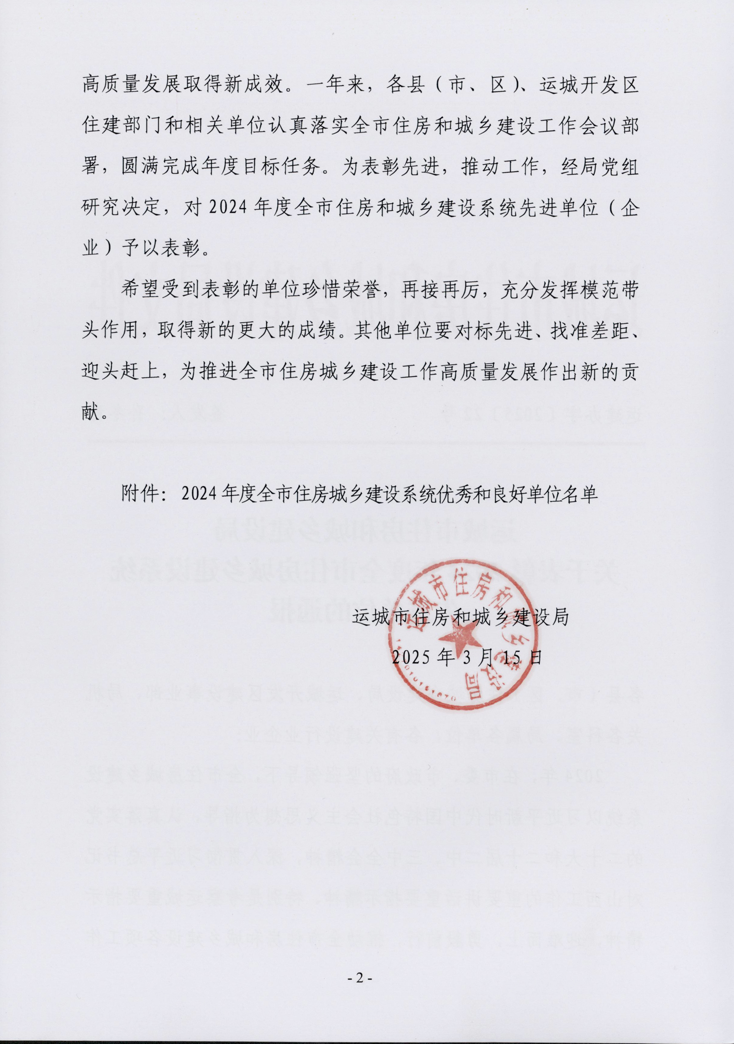 運城市住房和城鄉建設局發布了關于表彰2024年度全市住房城鄉建設系統優秀和良好單位名單,其中西建集團一舉斬獲四項殊榮。