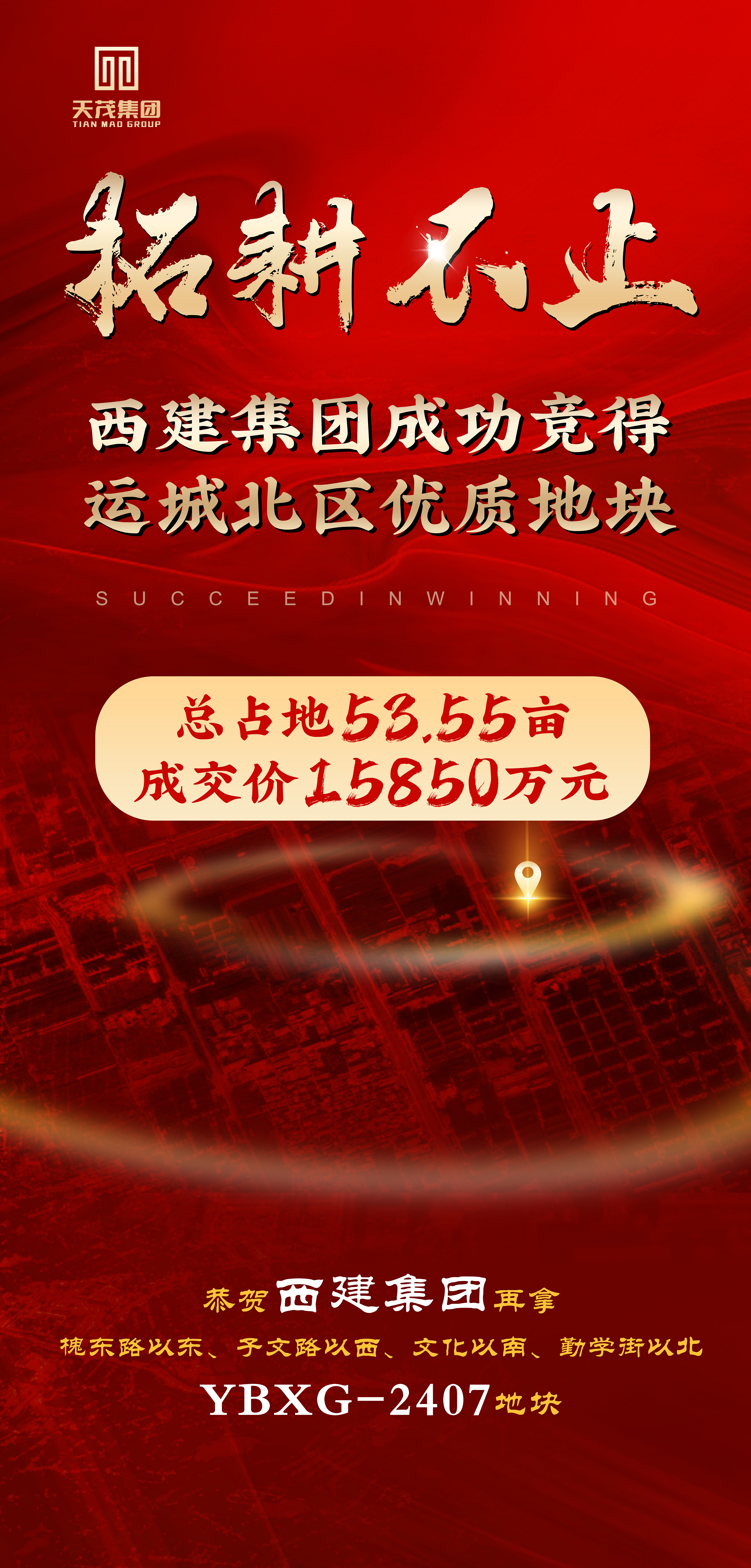6月3日,西建集團成功競得北城核心區域YBXG-2407地塊,地塊位于槐東路以東、子文路以西、文化街以南、勤學街以北。地塊總占地53.55畝,成交價為1.585億元
