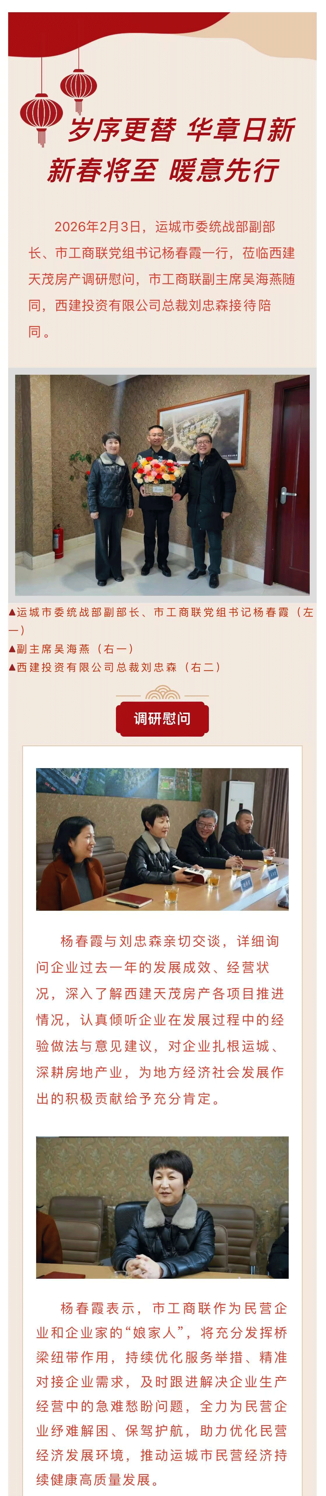 運城市委統戰部副部長、市工商聯黨組書記楊春霞一行蒞臨西建天茂房產調研慰問